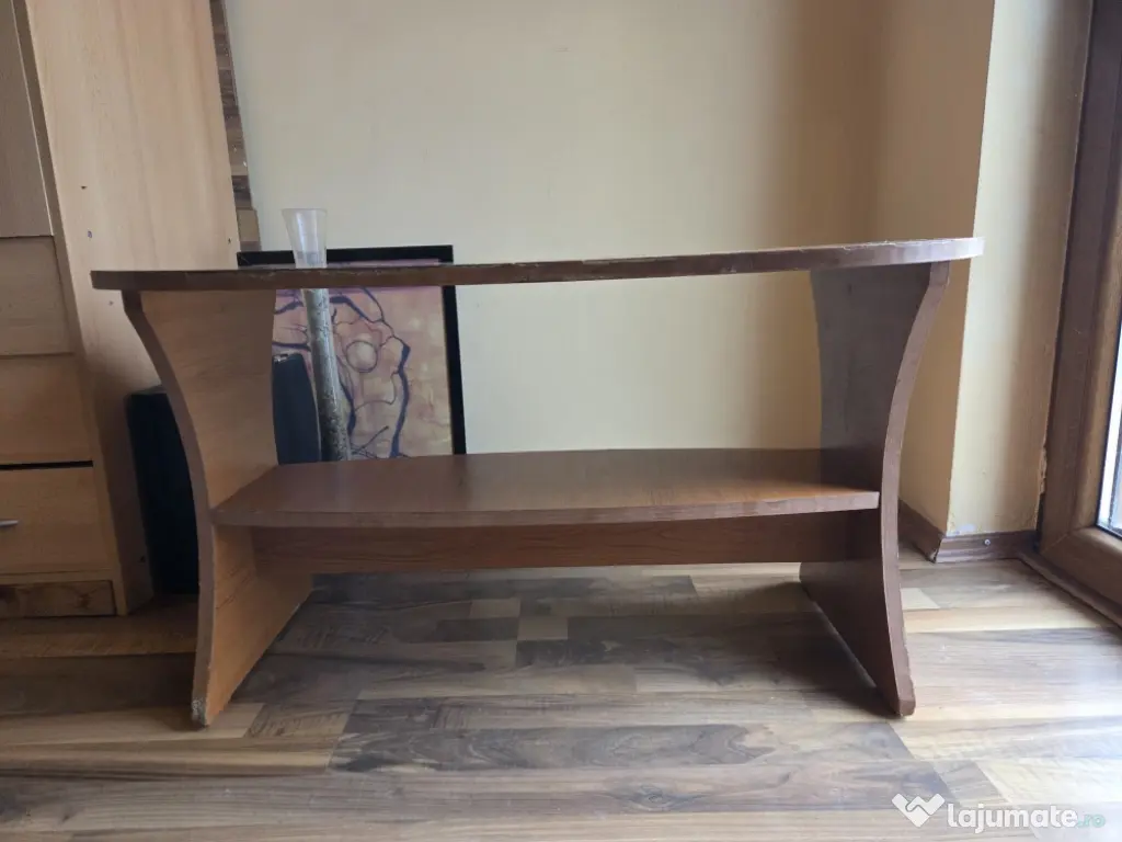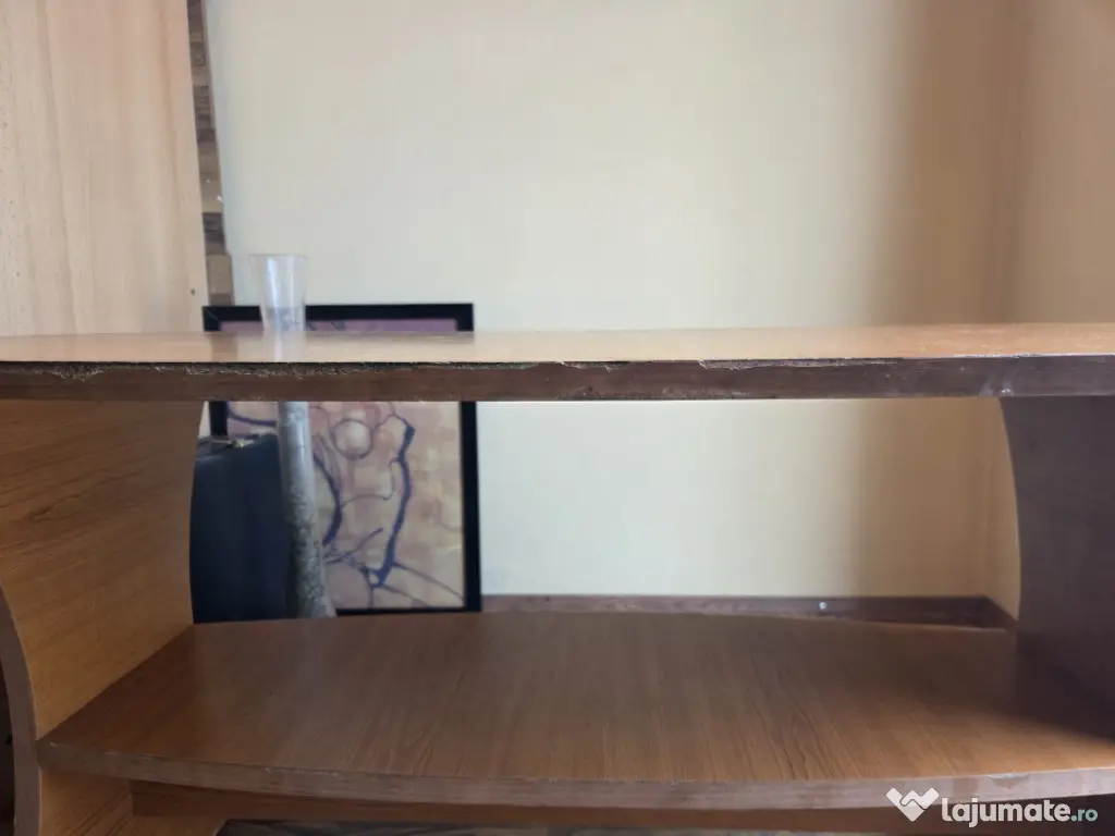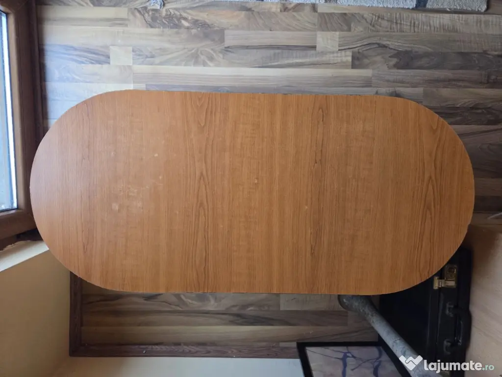 Masă ovală, în stare funcțională, rezistenta. Aspect usor uzat, se pot vedea defectele in poze ( marginea prezintă probleme- s au desprins bucati din material).