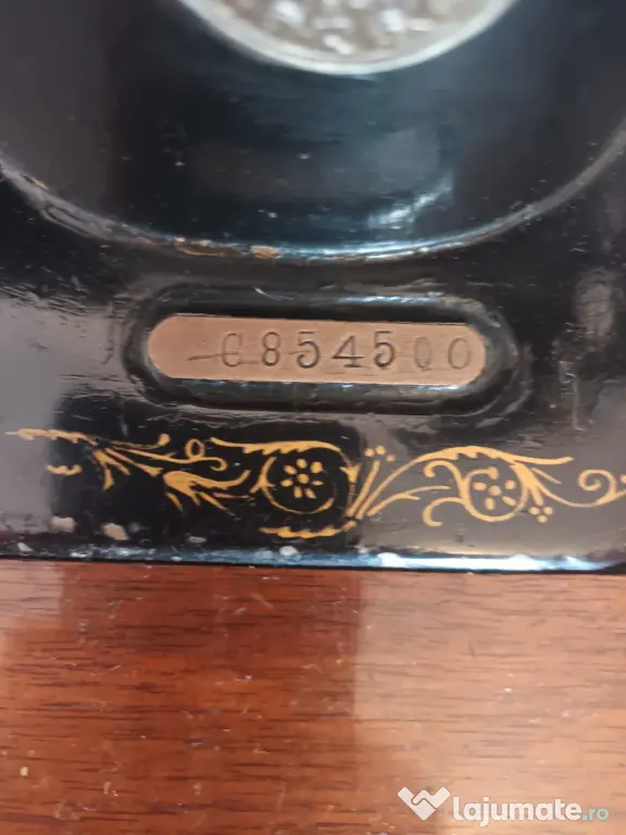 Model Singer Clasa 27 / 127 (folosește mecanismul clasic cu suveică alungită, tip glonț). Păstrează decorațiunile aurii originale cu motive florale, cunoscute de colecționari sub numele de Tiffany sau Gingerbread. Prezintă o patină a timpului firească și fermecătoare (uzură normală a abțibildurilor aurii în zona de frecare a materialului), care îi atestă autenticitatea. Vine montată pe masa originală din lemn, cu cadru și pedală din fontă masivă, prevăzută cu roți funcționale și sistemul original de curea. Vopseaua neagră originală își păstrează un luciu frumos, mecanismele se mișcă lin, iar lemnul este curat și stabil.