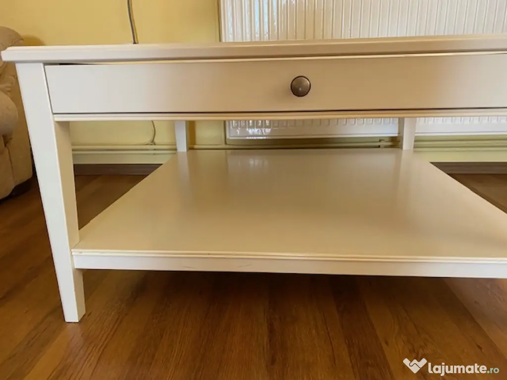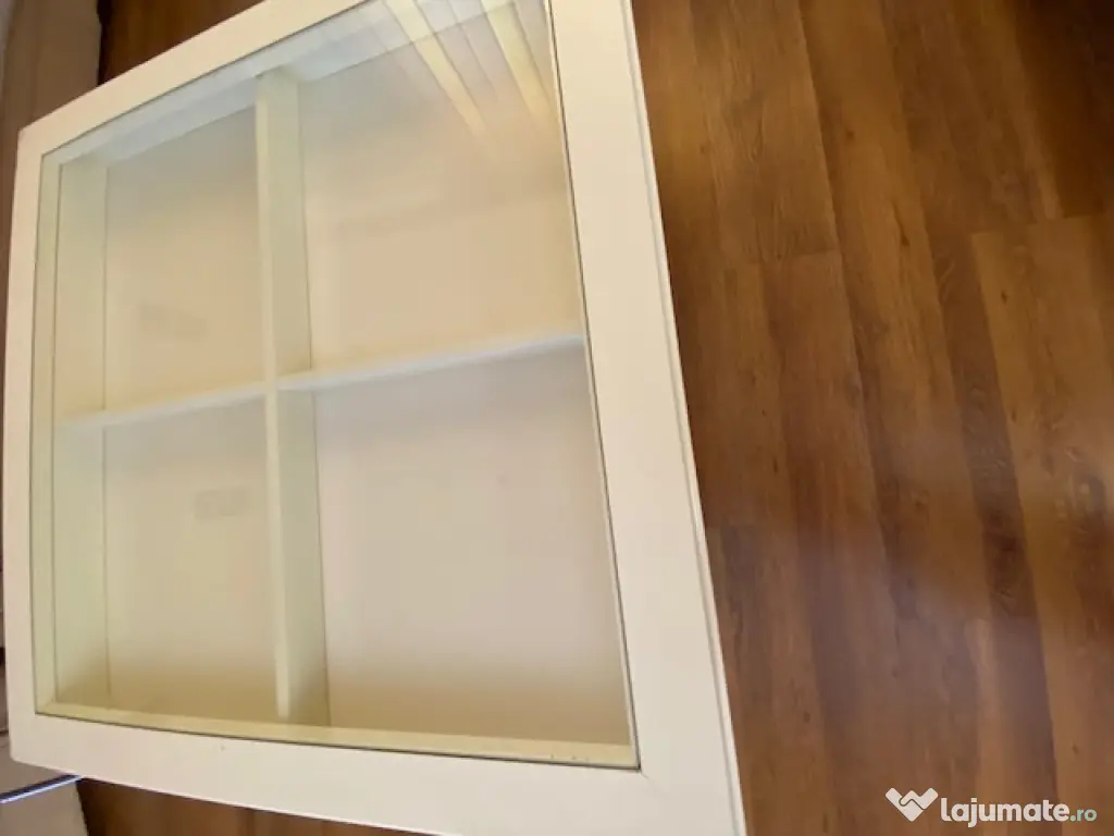 Masă de cafea construită din lemn alb, solidă, practică și decorativă pentru orice spațiu de locuit. Masa are un blat din sticlă si o compartimentare practică sub forma unui sertar pentru a expune diferite obiecte decorative.