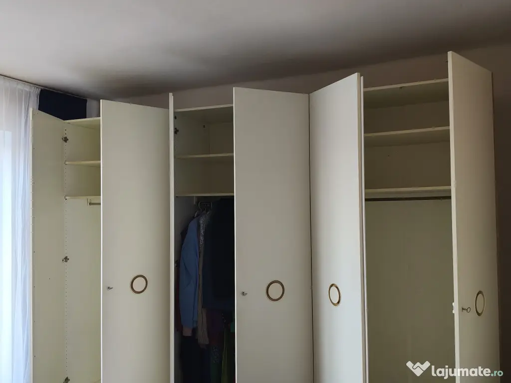 Mobilier de dormitor în stare bună, format din dulap cu 6 uși, pat de dormitor, 2 noptiere și 1 comoda. Mobilierul este în de culoare crem deschis si are urmatoarele dimensiuni:
