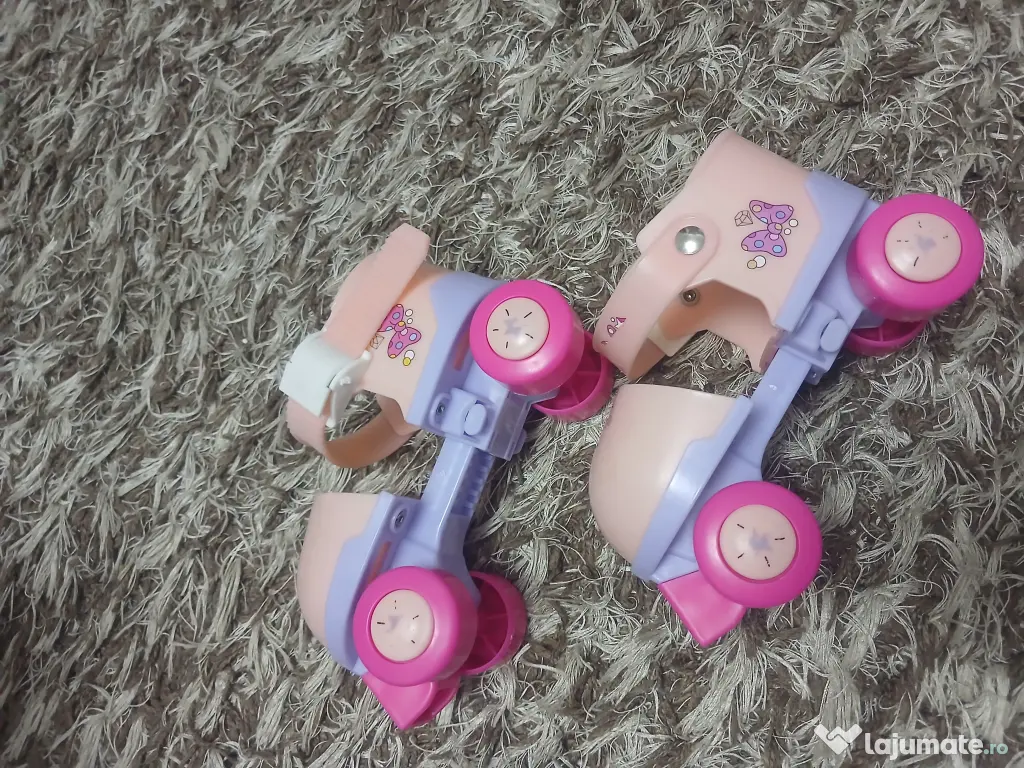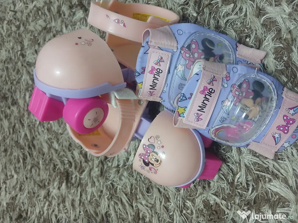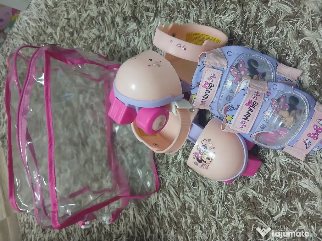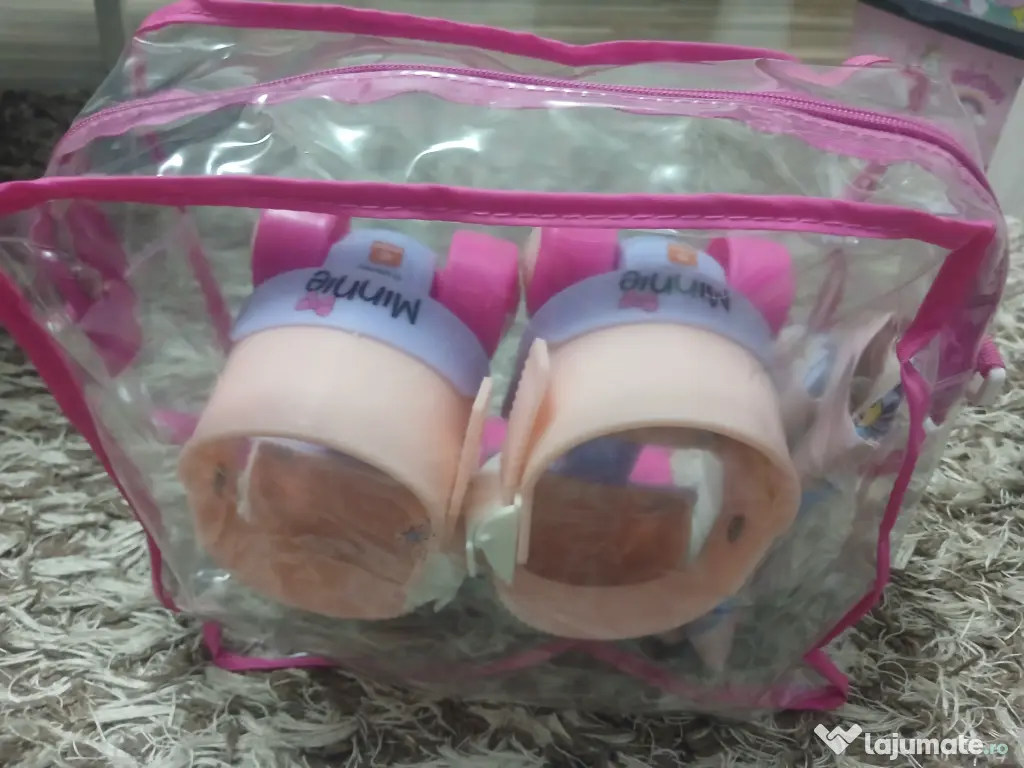 Vând Patine cu rotile roz Minnie Mouse cu echipament de protecție si geanta transparenta pentru transport ,mărime 22-29.