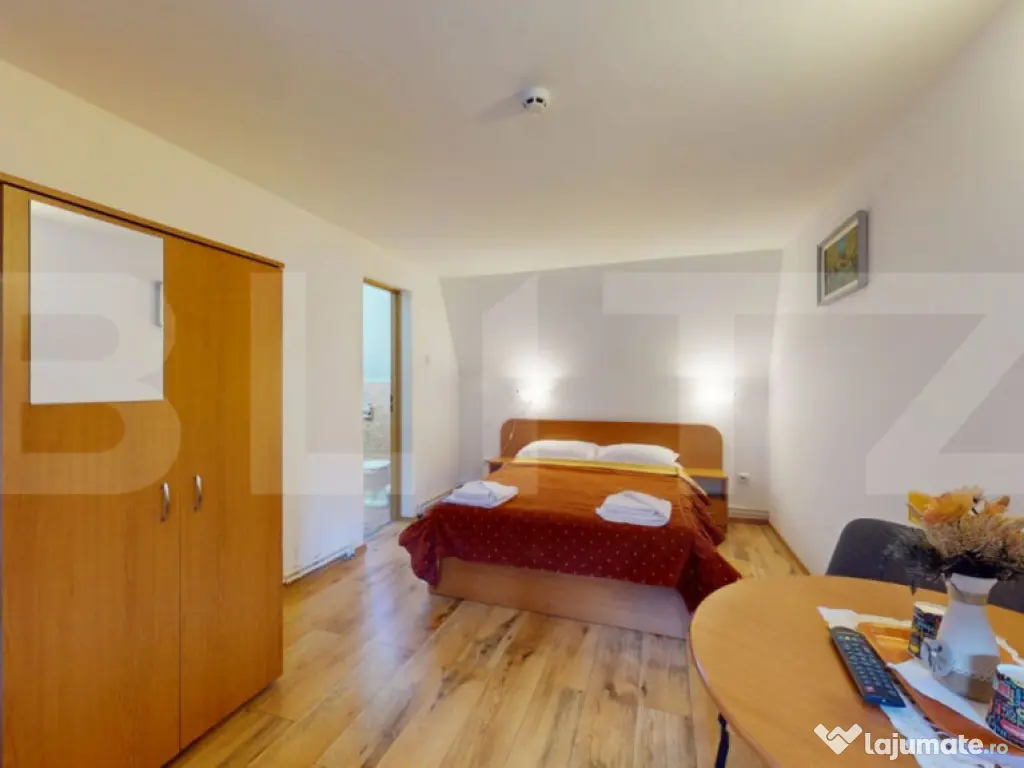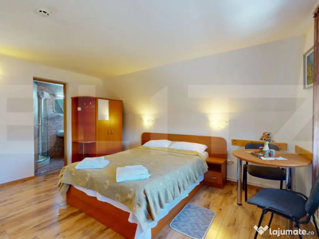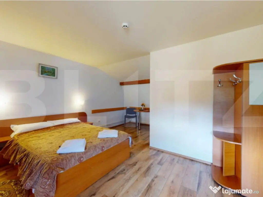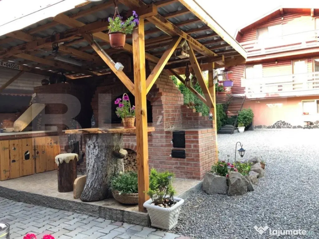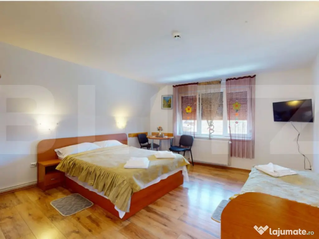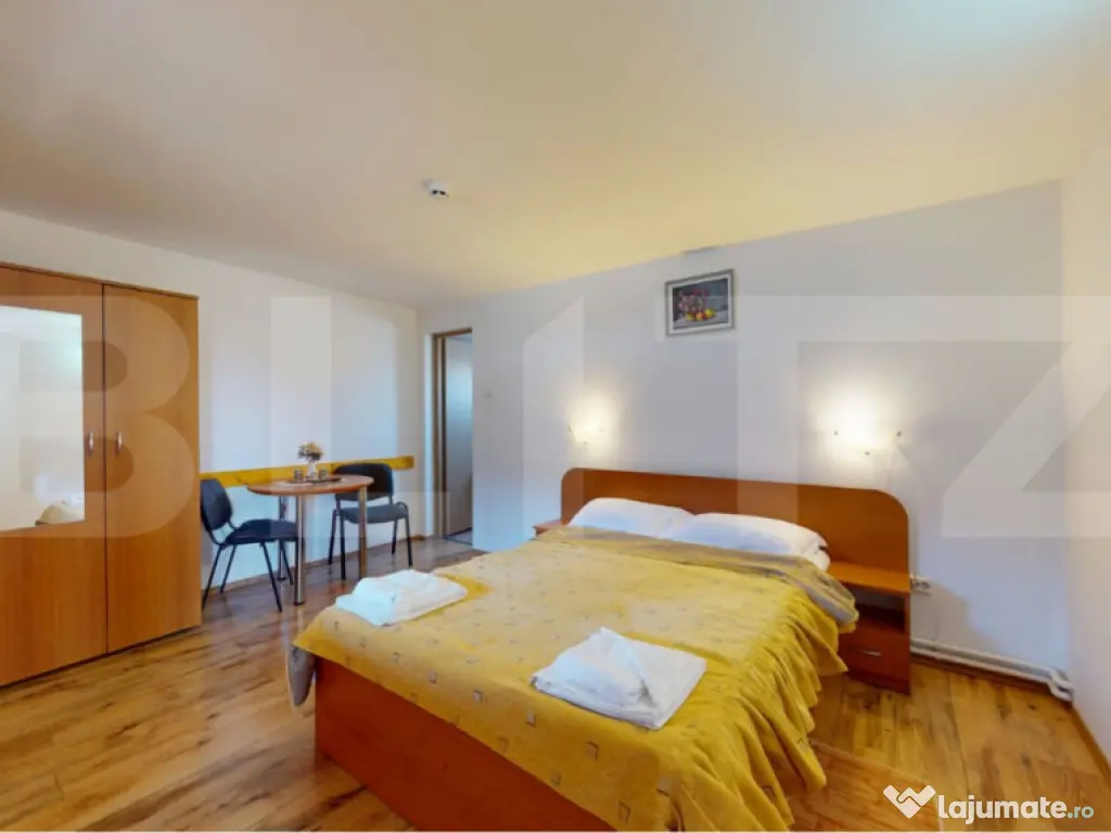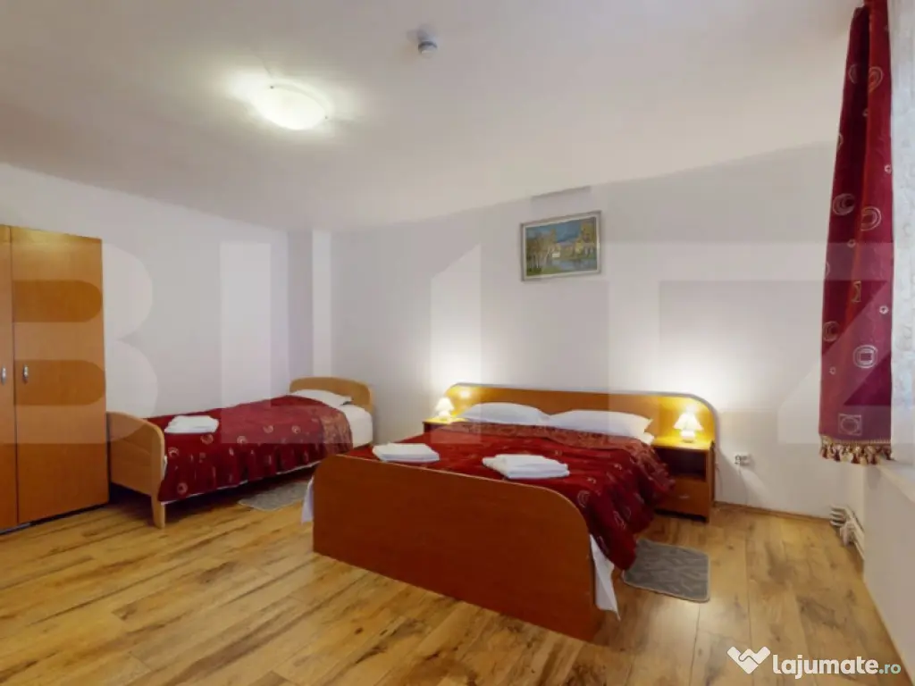 Blitz vă prezintă o proprietate turistică de excepție, situată în Săcele, județul Brașov, o pensiune complet echipată și operațională, concepută pentru randament imediat și dezvoltare sustenabilă în domeniul ospitalității. Date cheie ale investiției: Suprafață teren: 765 mp Suprafață construită: 655 mp Suprafață utilă: 433 mp 12 camere elegante, fiecare cu baie proprie 5 locuri de parcare Structură solidă din cărămidă Încălzire pe gaz Proprietate disponibilă imediat Concept & compartimentare: Proprietatea este organizată în 3 clădiri distincte, optim gândite pentru funcționare eficientă: Clădire frontală (1979) – zonă administrativă & logistică Construcție din cărămidă, ce integrează: Recepția pensiunii Cameră personal cu baie Spălătorie, cămară, bucătărie Pivniță tehnică cu sistem de pompare și rezervor de apă de 500 l Spațiu rezidențial: 3 camere, dressing și baie Clădirea principală (2008) – zona de cazare: 12 camere cu băi proprii, finisate funcțional Parter: 4 camere + bucătărie complet utilată 2 centrale IMERGAZ ZEUS – 35 kW (2024) pentru eficiență energetică Tâmplărie premium Rehau, ferestre Velux Scară interioară din lemn, cu posibilitate de montare lift Clădire secundară – restaurant & apartament privat Sală de mese elegantă Bucătărie profesională din inox Terasă acoperită Etaj (2018): apartament privat cu living open-space, 2 dormitoare, baie și vedere panoramică spre munți În zona din spate este integrat si un sistem solar pentru prepararea apei calde menajere, cu capacitate de 300 litri, contribuind la eficiența energetică a proprietății. Experiență & facilități exterioare: Curte amenajată peisagistic Iaz decorativ Ciubăr pentru relaxare Zonă gourmet: grătar zidit, rotisor, afumătoare Mobilier rustic din lemn masiv – atmosferă autentică și primitoare Argumente investiționale: ✔ Proprietate „la cheie”, gata de operare ✔ Infrastructură completă, fără investiții suplimentare majore ✔ Potențial ridicat de ocupare și extindere servicii ✔ Poziționare avantajoasă, aproape de Brașov și zone turistice O oportunitate rară pentru investitori care caută stabilitate, imagine și profit. Pentru detalii suplimentare și programarea unei vizionări, vă rugăm să ne contactați. Cod ofertă / ID BLITZ: P163737 Id intern: P163737 Număr niveluri imobil: 1 Număr Băi: 15 Nr. locuri parcare: 5-10 Curent Apă Canalizare Gaz