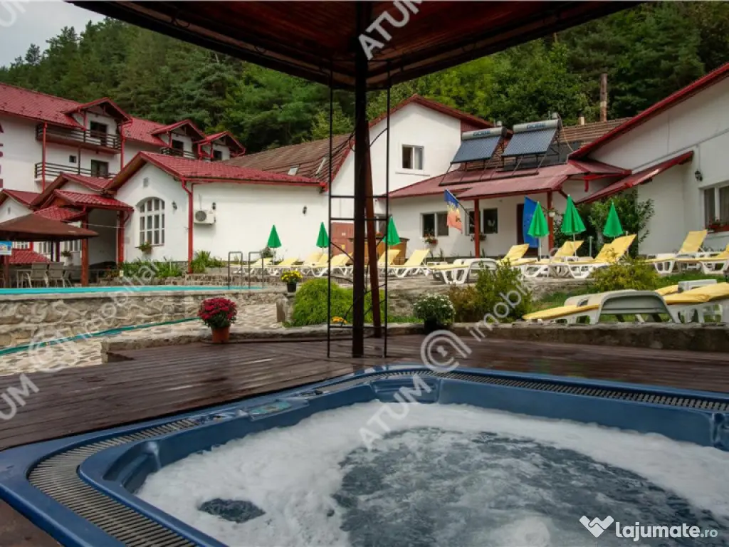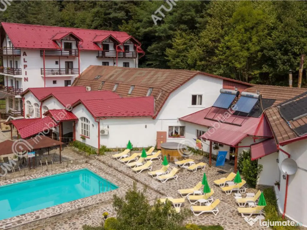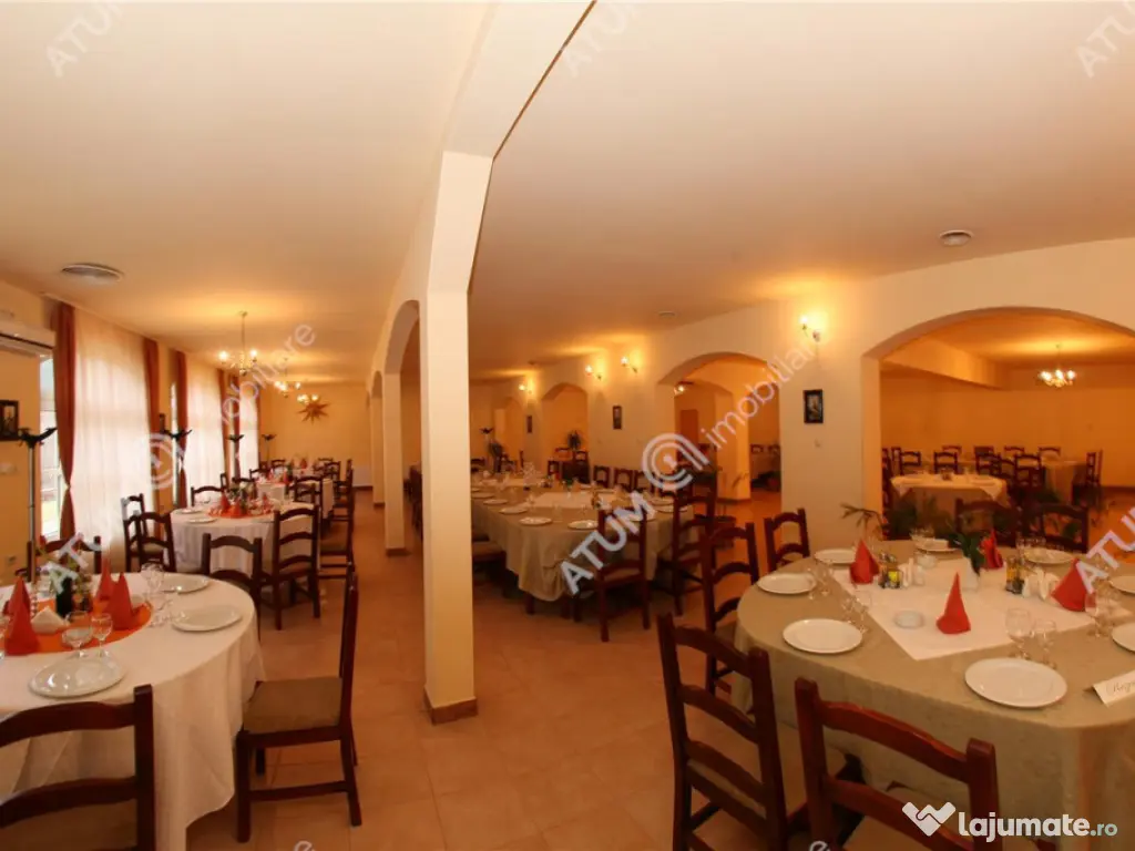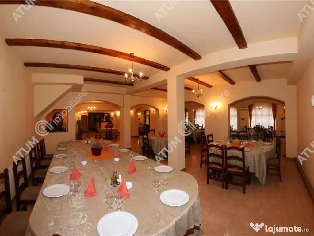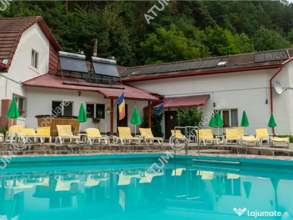 Va propunem spre achizitie o pensiune complet functionala, situata in inima comunei Rasinari, una dintre cele mai pitoresti localitati din Marginimea Sibiului. La doar 12 km de Sibiu si 20 de minute de statiunea montana Paltinis, proprietatea beneficiaza de o locatie strategica, ideala pentru turismul montan, cultural si de evenimente. Proprietatea este amplasata pe un teren intravilan de 6600 mp, amenajat cu gazon, imprejmuit cu gard intr-un cadru natural deosebit, ideal pentru relaxare, cu spatii verzi bine intretinute. Pensiunea este compusa din 2 corpuri (C1, C2), cu regim de inaltime S P 2E M, suprafata utila desfasurata este de 1130 mp, suprafata construita desfasurata de 1699 mp, amprenta la sol de 1056 mp, si este impartita dupa cum urmaza: - C1 a fost construit in anul 2007, cu regim de inaltime S P 1E M si este alcatuit astfel: subsolul: camera tehnica, crama si 2 pivnite, parter: hol, casa scarii, receptie, 8 camere, 8 bai, 2 bucatarii, restaurant, salon, birou, bar, 4 grupuri sanitare, 4 spatii depozitare, terasa acoperita, etajul 1 casa scarii, 13 camere, 10 bai, sala conferinte, 3 spatii depozitare, dressing, si balcon, etajul 2 casa scarii, hol, 8 camere, 8 bai, 9 balcoane, iar mansarda este compusa dintr-un spatiu multifunctional care poate fi transformat in camere de locuit cu bai, si 3 balcoane. - C2 a fost edificat in anul 2000 si este compus din P 1E, astfel: la parter gasim 5 holuri, 5 camere, camera termica cu 3 centrale pe peleti (2 de 80 KW respectiv 100 KW), 2 boilere de 300 si 500 litri, pufar de 1000 litri, curent trifazic, camera frigorifica, camera sauna, baie dusuri, spatiu relaxare, 3 spatii depozitare, 3 bai, 2 spalatorii, gang, iar etajul este compus din 5 camere, 4 bai, 2 spatii depozitare si balcon. Bucatariile sunt dotate cu echipament din inox si detin urmatoarele componente: hota, cuptor pizza, cuptor electric, 3 gratare pe gaz, blat de lucru. Pensiunea este construita din fundatie de beton, pereti din caramida, izolatie termica la exterior, plansee din beton, acoperis din tabla, usi interioare din lemn, usi de acces din PVC, tamplarie PVC cu geamuri termopane, geamuri de tip velux, pereti interiori imbracati in rigips, tavane din rigips si casetate, calorifere termostatate, sistem antifoc, sistem supraveghere video, hidrant interior, transformator. Proprietarea mai detine statie de epurare, 2 hidrofoare electronice, bazin de colectare de 1200 mc, automatizare poarta acces. La exterior, pensiunea ofera facilitati recreative precum piscina in aer liber, jacuzzi, ciubar traditional si o terasa din lemn destinata relaxarii Pensiunea este complet functionala, cu activitate turistica si de evenimente in desfasurare. Se vinde cu tot cu business-ul activ, infrastructura, echipamente si reputatie deja consolidata in zona, ideala pentru investitori care cauta o afacere la cheie, intr-un cadru natural de exceptie, cu acces rapid catre statiunea montana Paltinis si orasul Sibiu. Imobilul este disponibil la vanzare asa cum este prezentat, si valoarea de achizitie este de 1370000 euro negociabil, modalitatea de achizitie este prin credit ipotecar sau cash, in functie de solutia aleasa. ID proprietate: 2747 An finalizare construcție: 2007 Stadiu construcţie: Finalizat Număr încăperi: 36 Posibilitate parcare: Da Nr. locuri parcare: 20+