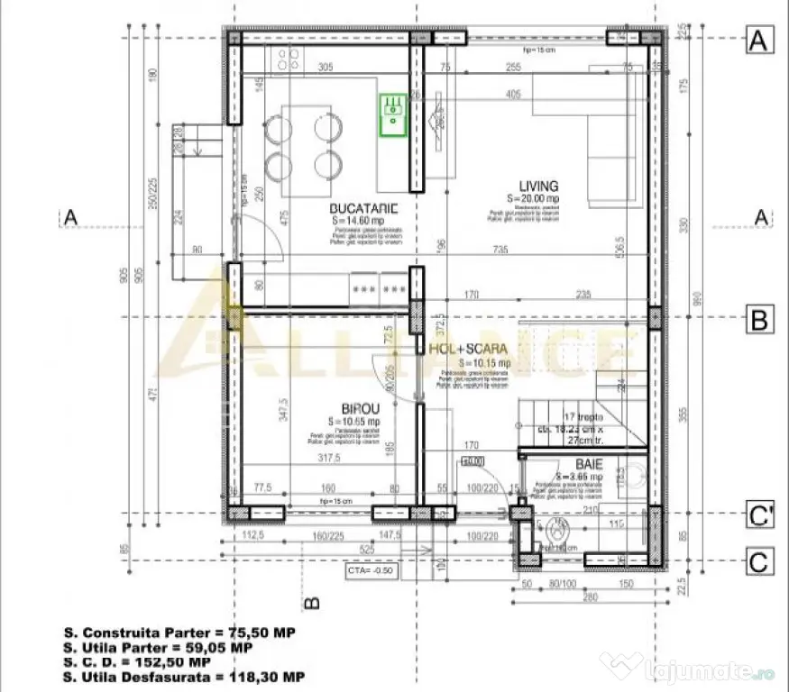 Aceasta face parte dintr-un ansamblu de 3 locuinte si dipune de o suprafata utila totala aproximativa de 118.3 mp .