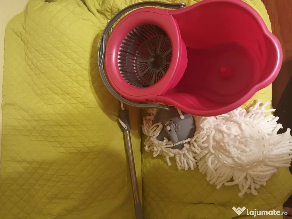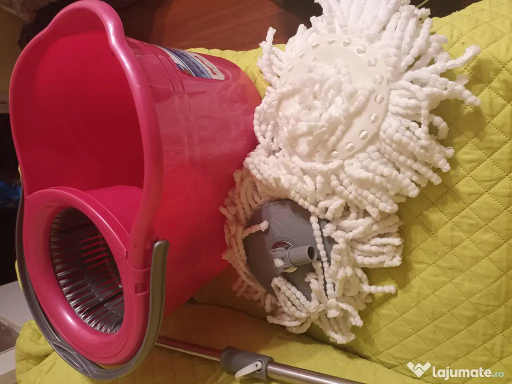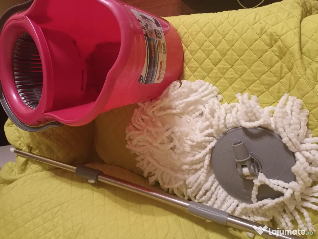 Set de curățenie nou, format din tija metalica telescopica, găleată din plastic cu sistem de stoarcere eficient al modului, mop absorbant și o rezerva de mop.