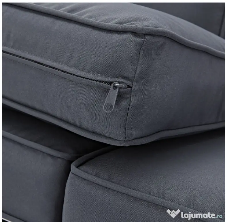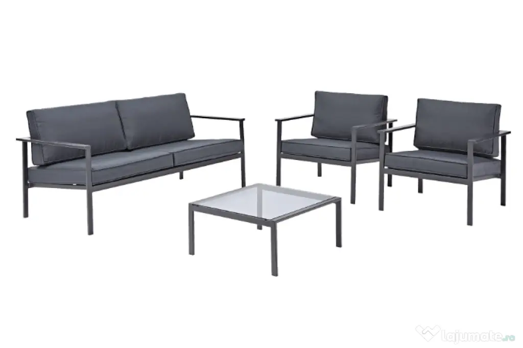 Setul de gradina contine 2scaune, 1 canapea + masa 4 oaspeti. Este prevazut cu 4 perne de sezut si 4 perne de spate cu huse detasabile, din poliester impermeabil.
