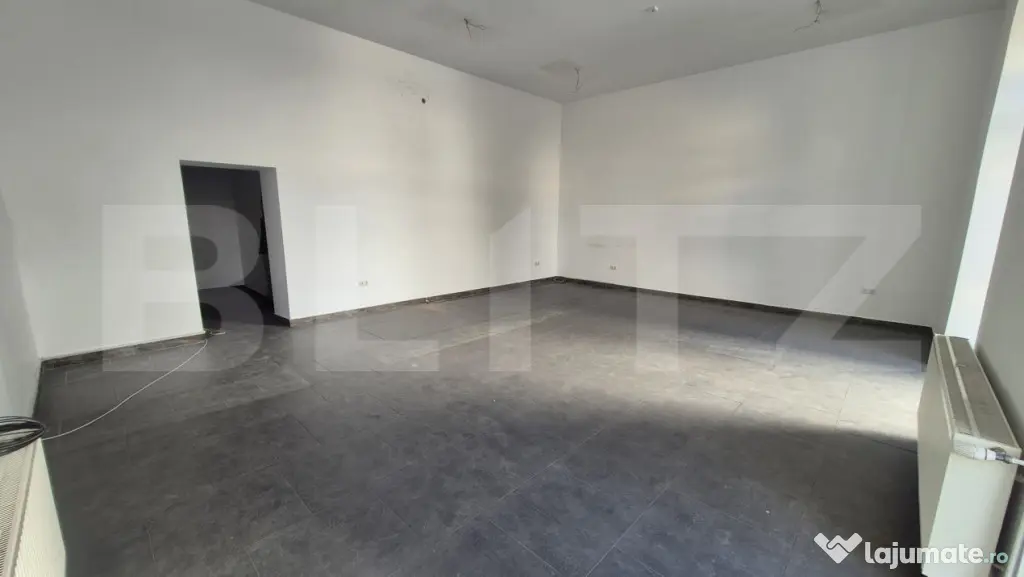????o incapere principala de 52,10 mp cu un geam mare care ofera vizibilitate si lumina naturala si o usa inalta si larga de asemenea din sticla pentru un plus de vizibiltate.