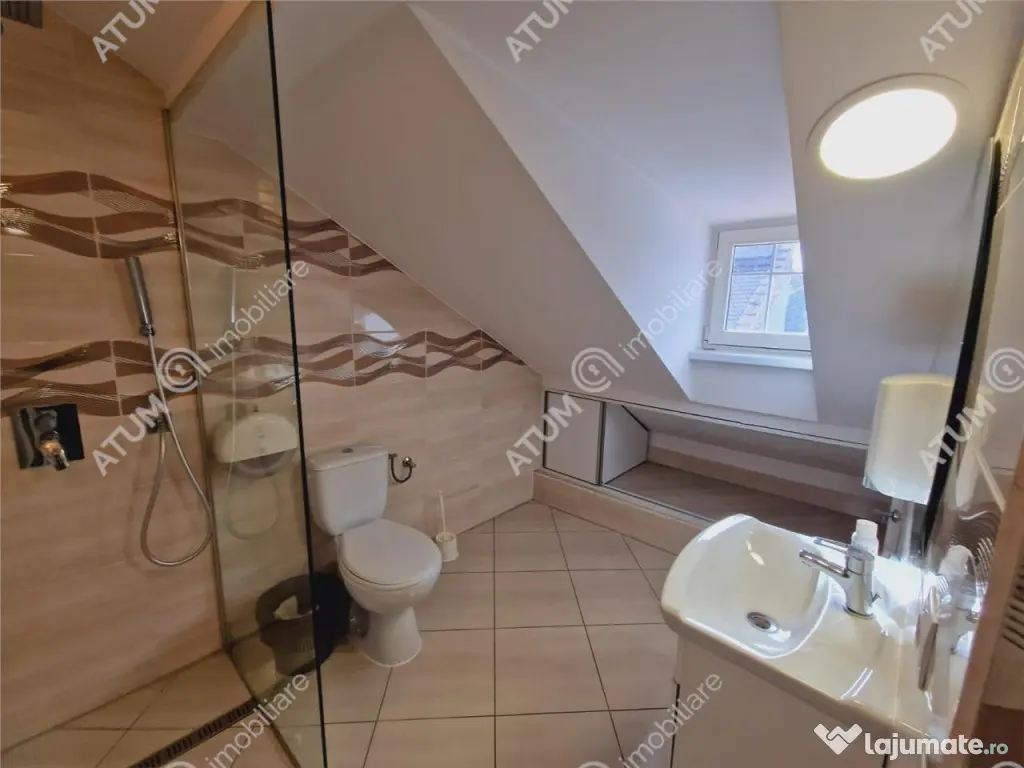 Spatiu pentru birouri de inchiriat in Centrul Istoric al orasului Sibiu orientat Sud-Estic cu acces privat si curte. Situat in zona istorica a orasului spatiul beneficiaza de expunere stradala si acces imediat catre punctele de interes ceea ce il face ideala pentru sediul unei companii, call center, spatiu birouri si multe alte activitati de birou. Imobilul a fost edificat in anul 1878 si renovat in anul 2020, beneficiaza de toate imbunatatirile si dotarile necesare activitatii de birouri (incalzire termica in pardoseala, calorifere din otel si instalatii din cupru, aer conditionat, sistem de alarma, supraveghere video, camera server etc). Spatiul se poare recompartimenta in functie de domeniul de activitate. Spatiul are 340 mp utili, este amplasat intr-o cladire compusa din Parter Mansarda fiind compartimentat astfel: 4 birouri individuale la etajul 1 cu 2 grupuri sanitare si un balcon in suprafata de 5 mp, iar la mansarda un spatiu deschis care poate fi compartimentat, care beneficiaza de grup sanitar si bucatarie mobilata si utilata. Disponibil imediat, acesta se inchiriaza la 2500 euro negociabil plus o luna garantie. !D intern: 2105 Suprafaţă totală: 413 m² An finalizare construcție: 1795 Stadiu construcţie: Finalizat Clasă birouri: A Înălţime spaţiu: 3 m Număr încăperi: 4 Număr Grupuri Sanitare: 3 Tip imobil: Bloc de apartamente