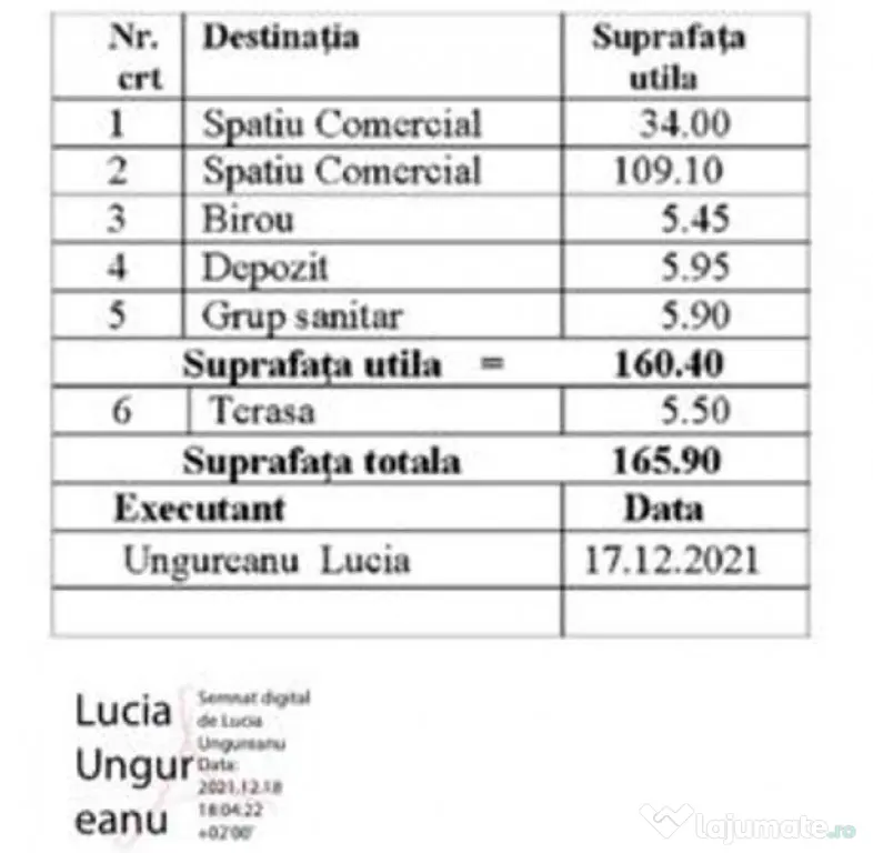 spatiu comercial cu o suprafață de 160,4mp utili + terasa de 5,5mp + 3 locuri de parcare dispuse in fata spatiului(aceasta fiind si una din cele trei zone de acces - a se vedea releveul atasat).