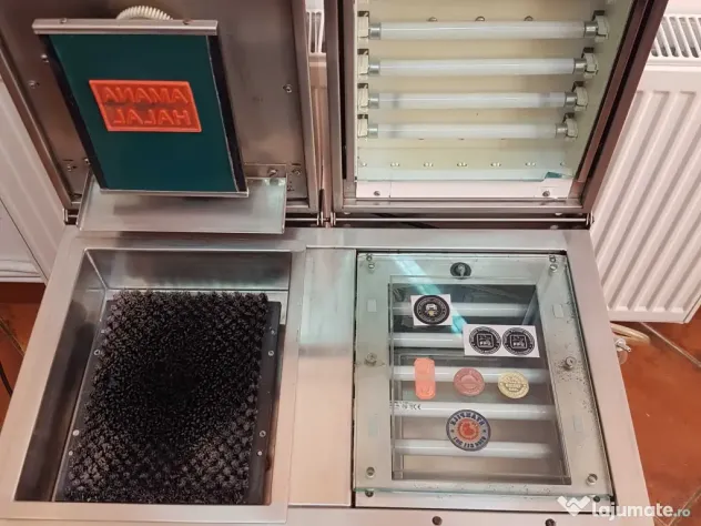 Dimensiunile mașinii de ștampile sunt L 60 l 50 î 32 cm și greutate de 37 kg. Dacă este posibil , ar fi de evitat transportul prin curierat.