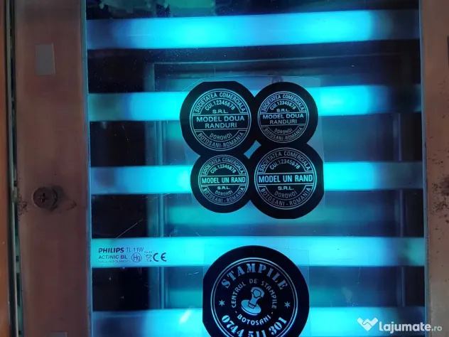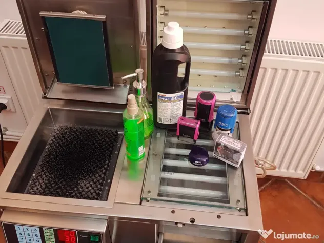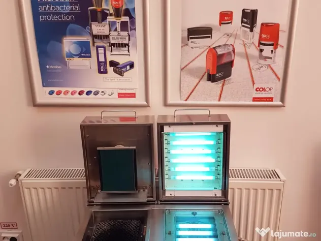 Masina stampile cu dublă expunere, model AZ 1500 - Fabricată în Austria. Este cea mai rentabila si fiabila masina de stampile pe polimeri. Este confectionata total din inox. Suprafata de lucru format A5 . În procesul de execuție se utilizează 12 neoane UV cu puterea de 11w fiecare. Timpul pentru executia stampilei: 25-50 secunde, în funcție de înălțimea caracterelor dorite. Pentru execuția de stampile se folosește: Polimer Ideal i50R plus sau plicuri cu polimer prefabricate pe dimensiuni. În procesul de execuție se mai pot folosi și alte materiale cum ar fi burete adeziv, folie protecție, calc plasticat - la realizarea șablonului pentru amprentă.