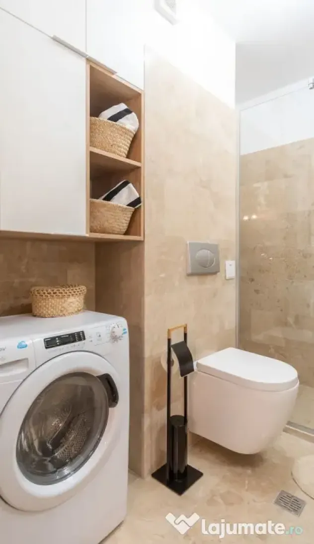 Va sunt puse la dispozitie : masina de spalat automata cu uscator, , combina frigorifica, televizor 4k Samasung. In bucatarie avem cuptor electric, plita pe gaz si o hota de putere mare.