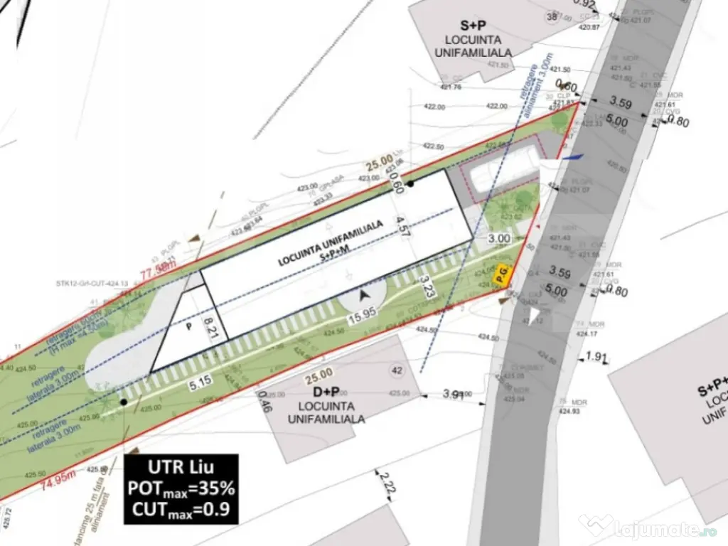 Blitz oferă spre vânzare o parcela de teren intravilan, situat in cart ANDREI MURESANU din Cluj-Napoca.Suprafața parcelei este de 560 mp având un front de 12 si acces direct din drum public asfaltat.Conform Pug Cluj-Napoca, terenul este încadrat in UTR-Liu- Zona este caracterizată de funcţiunea rezidenţială de densitate mică (predominant locuinţe unifamiliale).P.O.T. maxim = 35%, C.U.T. maxim = 0,9 regimul de construcție este permis-(S) +P+1+R. Terenul este in autorizare pentru construcția unei case individuale , in suprafata construita desfasurata de 158 mp ! S-a demarat procedura pentru obținerea unei autorizații de construcție având deja certificat de urbanism aprobat ! Pentru continuarea proiectului se asigura suportul arhitectului pentru finalizarea proiectului , planșe de arhitectura, documentațiile tehnice, avizările aferente ! Pentru mai multe detalii va stam la dispoziție, va așteptăm cu drag la vizionare ! Cod ofertă / ID BLITZ: P142500 Id intern: P142500