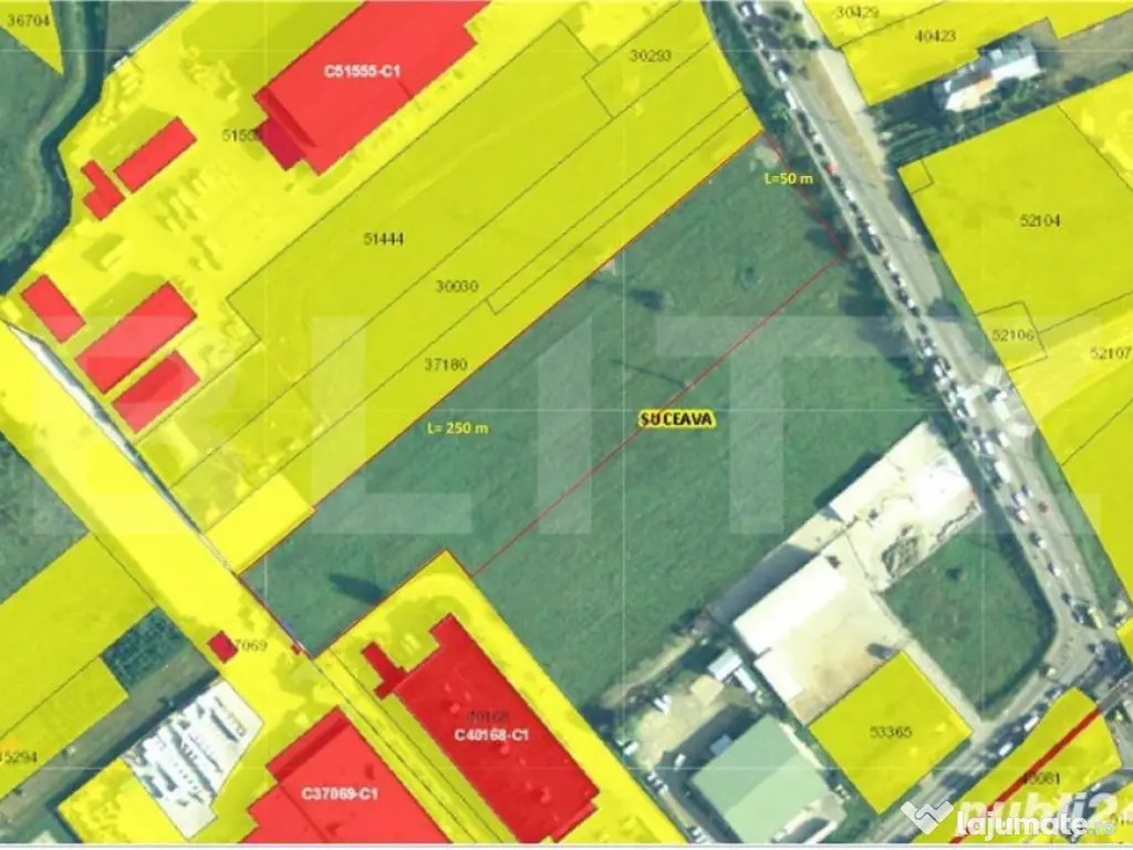 Blitz oferă spre vanzare teren intravilan situat în Municipiul Suceava. Suprafața măsoară 12478 mp, iar frontul stradal este de 50 ml. Accesul se face pe un drum public. (Inclusiv POSIBILITATE PARCELARE) Teren intravilan, 12.478 mp, la 110 e/mp, POT de 70%, acces direct din DN2 E58 - front 50 ml, expunere deosebită cu Certificat de urbanism, Periferie. De asemenea, dispune de Extras de Carte Funciara, Certificat de urbanism si PUD, în curs de finalizare. Utilitățile de electricitate și gaz se află la limita terenului, iar apă este vis-a-vis (vizavi) de teren. Mențiune: destinația terenului stabilită prin PUG, HCL - parțial zonă de dezvoltare locuințe cu regim mic de înăltime (P - P+2), spații verzi și parțial zonă de dezvoltare instituții publice și servicii și spații verzi. Ca urrnare a dezvoltării urbane zona a devenit mixtă: s-au edificat construcții cu destinație industrială, de prestări servicii si comerciale (showroom). Alte specificații: - acces direct din DN2 E58 - Ideal pentru construcție hale și parcare cu POT de 70% conform certificat de urbanism: - Posibilitate de parcelare. Vă așteptăm la vizionare! Cod ofertă / ID BLITZ: P12550 Id intern: P12550