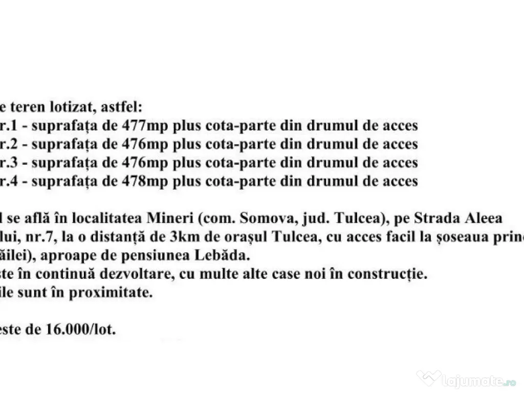 TEREN - LOTIZAT ????Locatie - MINERI (dupa pensiunea LEBADA ) Am lotizat pentru ????tine un teren in suprafata de 2000Mp.???? ▪️Pozitie foarte buna, acces usor din asfalt pe strada pietruita, ▪️In apropiere gasim case -construite recent ????UTILITATI : apa (este pe strada) curentul urmeaza sa vina sa fie montat stalpul (s-a achitat taxa catre Enel ) ????PRET / LOT = 16.000 euro fix LOT NR.1 =477mp LOT NR.2 = 476mp LOT NR. 3 = 476mp LOT NR. = 478mp ☎️DETALII 0751 584 242
