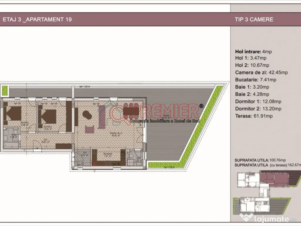 Timpuri Noi - 3 camere cu terasa - 10 min Metrou Apartamentul de 3 camere se afla la etajele 3 dintr-un imobil nou construit in imediata apropiere de statiei de metrou Timpuri Noi. Este impartit astfel, 100 de metri patrati utili plus o terasa de 63 metri patrati. Fiind amplasat la etajul 3, apartamentul beneficieaza de liniste si intimitate. Locatia este excelenta, fiind pozitionat la 10 minute de mers pe jos fata de statia de metrou Timpuri Noi. In apropiere se afla centrul comercial Mall Vitan, precum si magazine, scoli, gradinite si restaurante. Apartamentul are dotari si finisaje de lux: - Tamplarie salamander cu 3 geamuri si profil de 92 mm - Parchet laminat - Gresie si faianta moderna - Prize si intrerupratoare Legrand - Centrala termica - Incalzire in pardoseala - Usi interioare celulare - Usa intrare metalica Blocul are parcare subterana si adapost ALA. Parcarea subterana se poate achizitiona separat. * PRETURILE NU INCLUD TVA * Serviciul nou oferit de PREMIER Imobiliare! Solicita acum VIZIONARE ONLINE pentru aceasta proprietate! COMISION 0% Această proprietate se poate achiziționa prin orice tip de credit bancar. Departamentul nostru financiar Premier Credit Hub vă stă la dispoziție GRATUIT (comision 0%) pentru: - identificarea celei mai bune soluții de finanțare; - întocmirea dosarului bancar complet; - obținerea rapidă a creditului necesar achiziției. Beneficiați de un serviciu ALL IN ONE, cu acces direct la ofertele tuturor băncilor comerciale din România. Se acceptă inclusiv venituri din străinătate, astfel încât fiecare client să poată cumpăra în cele mai avantajoase condiții. Solicitați acum o simulare de credit direct din anunț sau cereți detalii consultantului Premier Imobiliare! Confort: 1 Tip imobil: Alte tipuri Număr Băi: mai mult de 3 Posibilitate parcare: Nu