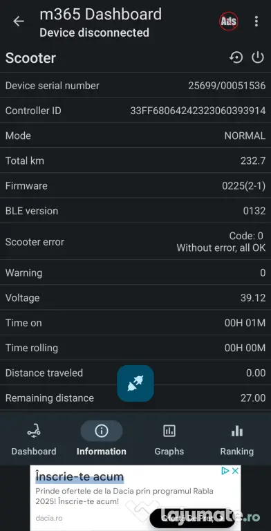 Este in stare foarte buna, are doar 240 km. Se blocheaza prin aplicatia m365 dashboard, are alarma la miscare.