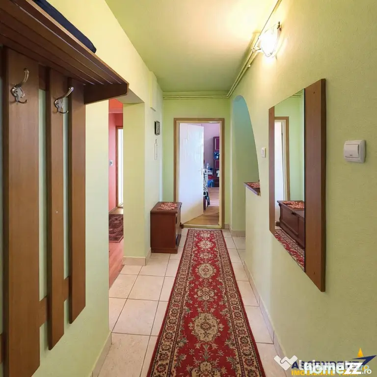 Accesul se face printr-un hol generos, care face legatura cu baia dotata cu dus si cu bucataria separata. Zona de zi este reprezentata de un living luminos, cu iesire pe balcon deschis, ideal pentru momente de relaxare. Dintr-un al doilea hol se face accesul catre cele trei dormitoare, dintre care unul beneficiaza de balcon si vedere directa spre Primarie, un detaliu care adauga valoare si identitate proprietatii. In plus dispune de o camara, utila pentru depozitare.