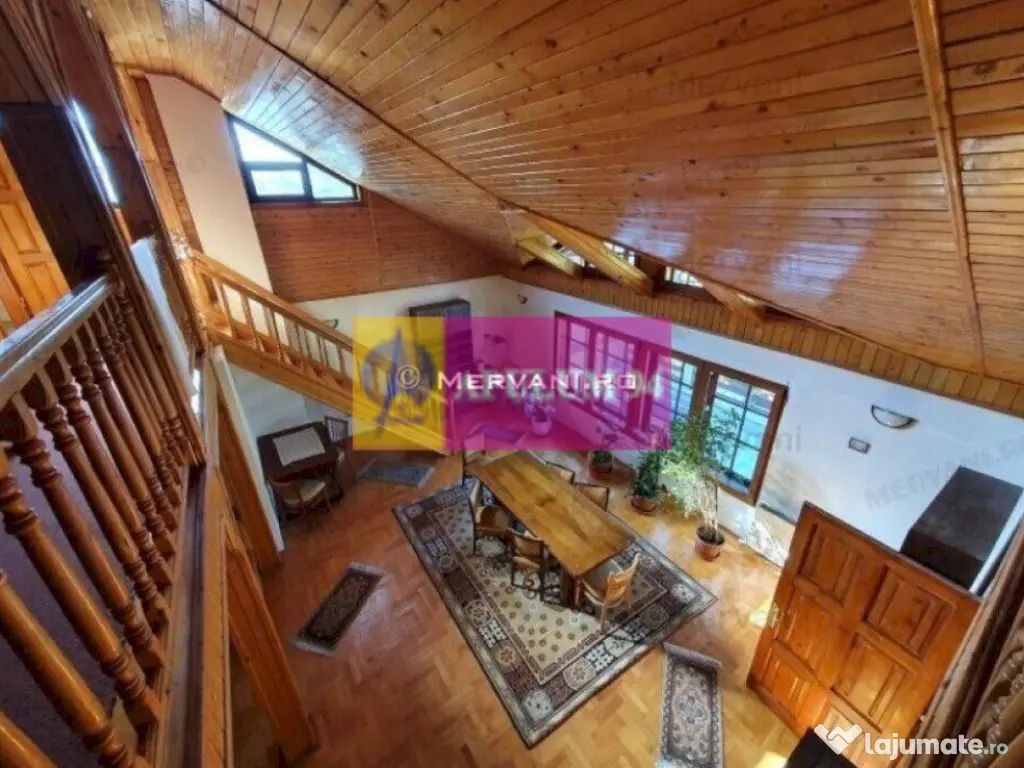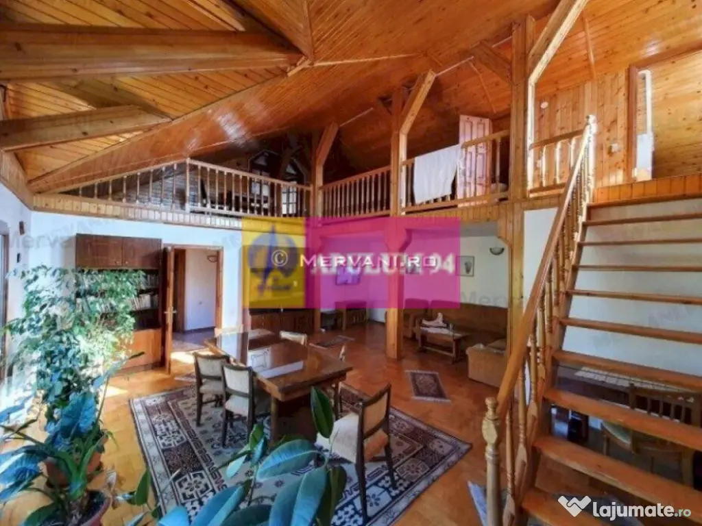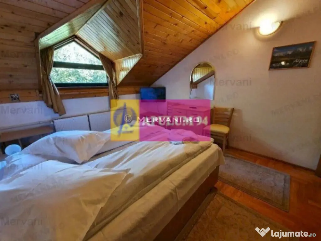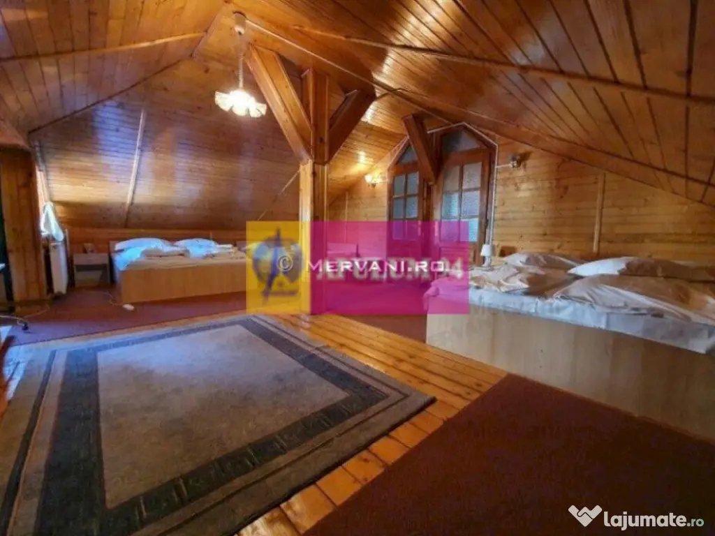 Vila turistica de vanzare in Busteni, avand o suprafata totala de 630 mp, un regim de inaltime P+E+M si fiind edificata pe un teren in suprafata de 1100 mp. Aceasta are urmatoarea structura: Parter: Living cu semineu functional si dining cu iesire pe o terasa deschisa de apr 50 mp, bucatarie, 4 dormitoare, 4 bai, 1 wc de serviciu, camera tehnica, hol si casa scarii; Etaj: Living room cu iesire pe o terasa exterioara de 34 mp, bucatarie, 5 camere, 4 bai, hol si casa scarii; Mansarda: Camera de 52 mp si un grup sanitar. Vila dispune de un garaj in suprafata de 52 mp, o curte amenajata cu alei pietonale, gazon si arbusti ornamentali. Se afla intr-o zona usor accesibila si beneficiaza de o priveliste panoramica deosebita catre masivul Caraiman. Număr niveluri imobil: 1 Număr Băi: mai mult de 3 Posibilitate parcare: Nu Curent Apă Gaz Încălzire