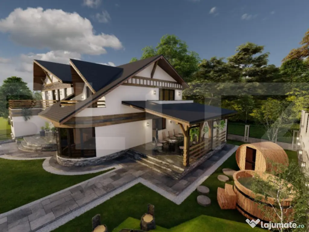 Blitz imobiliare va propune spre vanzare Vila cu potențial turistic în inima zonei montane Voroneț, o proprietate generoasă, gândită inteligent pentru a îmbina confortul unei locuințe spațioase cu oportunitatea dezvoltării unei afaceri în turism. Cu o suprafață utilă de 287 mp, imobilul oferă o compartimentare ideală pentru regim de pensiune, având nu mai puțin de 7 dormitoare și multiple spații de relaxare. Parterul este dedicat zonelor de zi, cu două livinguri luminoase ce pot servi atât ca spații comune pentru oaspeți, cât și pentru relaxare în familie, completate de bucătărie, două dormitoare și două băi. Etajul continuă armonios cu încă 5 dormitoare, oferind capacitate generoasă de cazare. Proprietatea este completată de un demisol funcțional, unde regăsim un garaj de 65 mp și pivniță, precum și de spații exterioare atractive: două terase și două balcoane, ideale pentru a valorifica priveliștea naturală a zonei. Amplasarea este un real avantaj — într-o zonă liniștită, cu pensiuni în vecinătate, ceea ce confirmă potențialul turistic al locației. Panorama și aerul de munte creează cadrul perfect pentru relaxare. Construcția este realizată din cărămidă, cu etaj din lemn pentru optimizarea structurii, iar finisajele interioare sunt gândite pentru funcționalitate și estetică: tâmplărie PVC cu geam termopan și pereți finisați cu rigips pentru suprafețe perfect drepte. Accesul este facil, pe drum asfaltat până în apropierea proprietății. Această proprietate reprezintă o oportunitate excelentă atât pentru investiție, cât și pentru o locuință personala într-un cadru natural deosebit. Cod ofertă / ID BLITZ: P168664 Id intern: P168664 Număr niveluri imobil: 1 Număr Băi: 4 Nr. locuri parcare: 4 Curent Apă