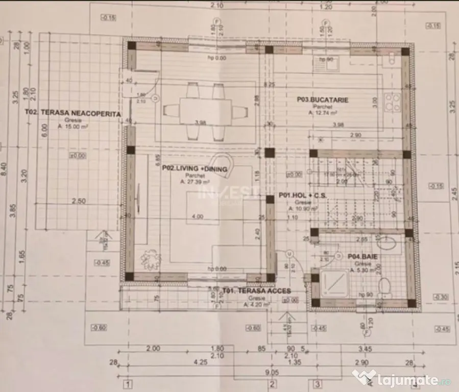 Parter: hol de acces, grup sanitar, bucătărie și sufragerie cu acces către terasă;