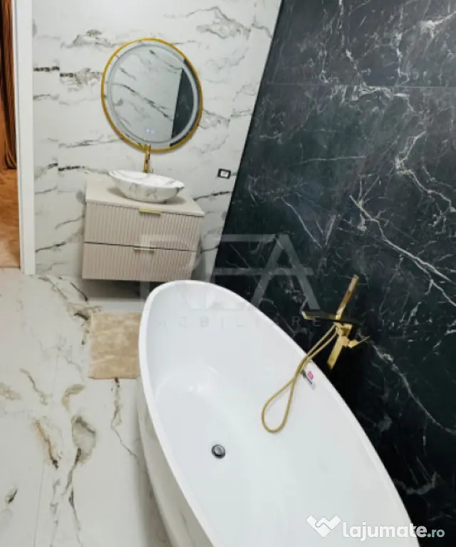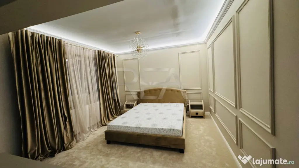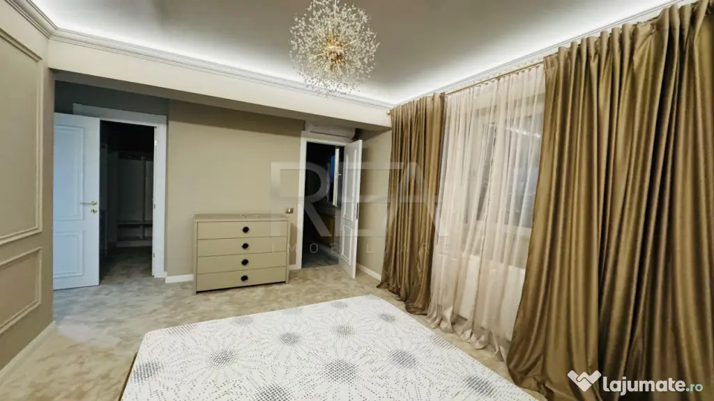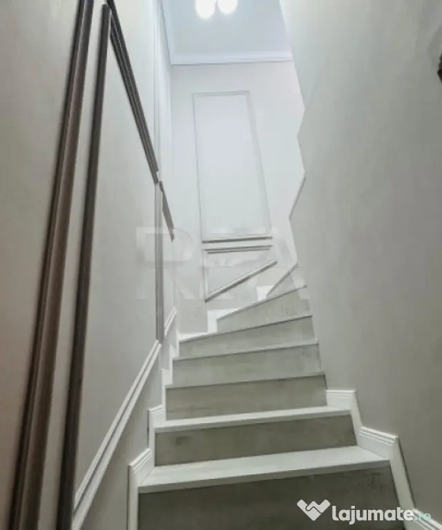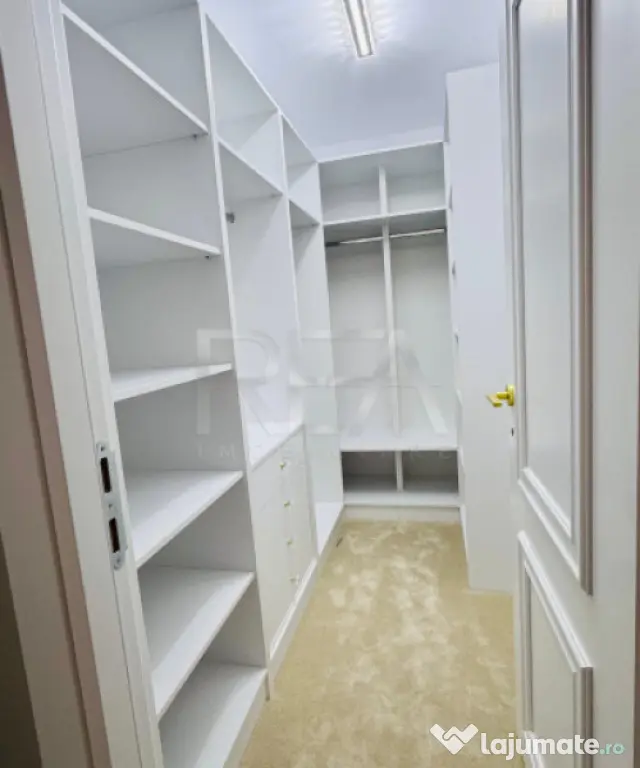 Etaj: două dormitoare, fiecare cu baie proprie (dormitor matrimonial și dormitor de oaspeți), plus un dressing cu acces direct din dormitorul matrimonial.