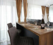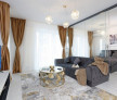 Living-ul are canapea confortabila extensibila din catifea pentru 3 persoane si televizor curb Samsung de 138 cm. Dormitorul beneficiaza de pat matrimonial de 180x200 cm din catifea (cu doua seturi de perne si lenjerii de pat de lux), noptiere cu veioze, aer conditionat si dresing multicompartimentat cu usi glisante silentioase si oglinzi din podea in tavan.