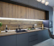 Bucataria este complet mobilata cu o multitudine de spatii de depozitare si utilata cu electrocasnice incorporate: frigider Beko si masina de spalat vase Hansa, plita, hota, cuptor electric si cuptor cu microunde - toate Samsung cu clasa energetica eficienta. Pe langa farfurii, tacamuri, pahare, oale speciale pentru inductie si altele - bucataria are insula cu doua locuri de luat masa si expresor inclus pentru cafea.