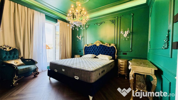 Locuința se remarcă printr-un design rafinat, cu accente regale și finisaje atent alese. Livingul si dormitorul sunt vedetele acestui apartament: pereți în tonuri închise, decorațiuni clasice, candelabre cu cristale și mobilier de inspirație barocă, ce creează o atmosferă sofisticată și exclusivistă. Este o proprietate care spune o poveste și oferă o experiență de locuire aparte, potrivit pentru cei care caută mai mult decât un simplu spațiu de închiriat.