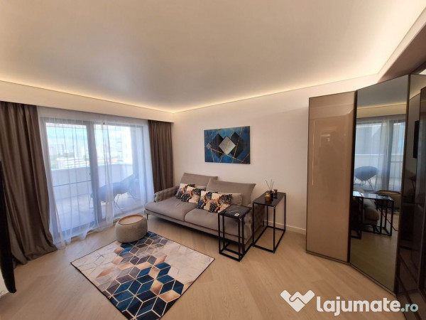 Apartamentul este mobilat si utilat complet, cu electronice si electrocasnice de ultima generatie, de cea mai buna calitate. Bucataria a fost realizata pe comanda, cu electrocasnice incorporabile marca Whirlpool, si frigider incastrat de la Samsung. Apartamentul beneficiaza de 2 aparate de aer conditionat de la LG, unul in living si unul in dormitor. Din living avem acces catre o terasa de 10 mp, foarte lata, acoperita complet de balconul de deasupra, ce ofera o vedere libera si intimitate. In apartament s-au investit foarte multi bani, timp si munca, fiind pus la punct din toate punctele de vedere, rezultand astfel o locuinta impecabila. Ansamblul rezidential din care face parte apartamentul, este situat intr-o locatie premium, in zona de Nord si ofera acces la spatii verzi de peste 10 000 mp, la spatiu wellness dar si la un bazin de inot semi-olimpic. Imobilul beneficiaza de 2 lifturi moderne OTIS ce merg pana in subsol. Ne dorim un chirias pe termen lung, serios si care sa aprecieze confortul pe care il ofera aceasta proprietate. Lasam imaginile sa vorbeasca despre acest apartament superb.