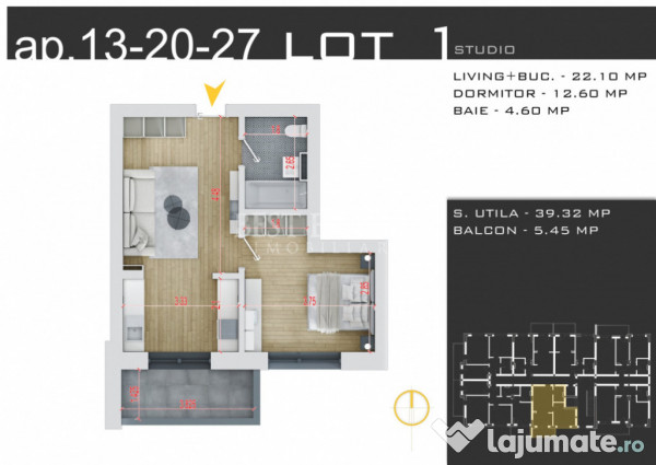 Suprafata utila - 39.32 mp utili +5.45 mp balcon, total 44.77 mp utili