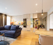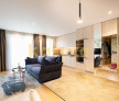 In suprafata utila de 65 mp la care se adauga terasa (12mp) cu acces din living. Bucataria este de tip open space, dar permite separarea cu sticla, avand si geam.