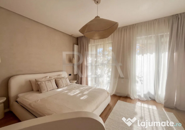 Zona de zi beneficiază de ferestre ample și acces direct către grădină, bucătăria este integrată și complet utilată, dormitorul matrimonial dispune de dressing și acces la balcon, iar cele două băi sunt finisate premium, una dintre ele cu walk-in shower.