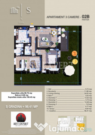 Suprafata utila -106.45 mp utili +9.69 mp balcon, gradina 96.41 mp, total 202.86 mp utili
