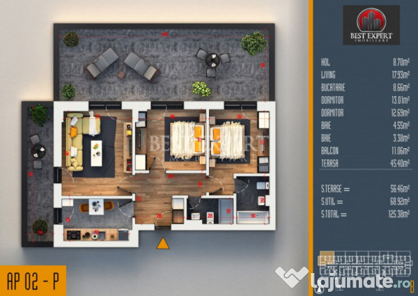 Suprafata utila - 68.92 mp utili +56.46 mp balcon, total 125.38 mp utili
