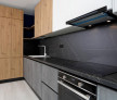 Bucătărie ultra-modernă, realizată la comandă de Maya Mobexpert, dotată cu sisteme Blum, electrocasnice Franke integrate, insulă Mobexpert cu scaune asortate, masă dining Mobexpert, plus frigider de vinuri Klarstein.