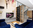 Living impresionant cu două canapele Chesterfield Mobexpert, bibliotecă și dressing personalizate Total Mobconstruct, TV Samsung The Frame + sistem audio Samsung, aer condiționat Daikin Emura 18.000 BTU, corp de iluminat spectaculos Ozkan cu 24 de becuri, tablouri personalizate Mobexpert și pereți artistici semnați Emphaty by the Wall.