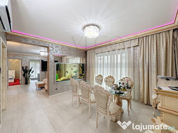 Locuința se desfășoară pe o suprafață utilă foarte generoasă, de 100 mp, beneficiază de o terasă de aproximativ 50 mp, se închiriază complet finisată, mobilată și utilată, cu materiale și electrocasnice de înaltă calitate, inclusiv cu mașină de spălat vase, mașină de spălat rufe cu uscător, 2 TV LCD Sony 175 inch, cabină duș cu hidromasaj și saună, draperii cu sistem de acționare electrică și multe alte facilități, iar confortul termic este asigurat pe tot parcursul anului de centrala termică individuală cu sistem de încălzire prin pardoseală și aparatul de aer condiționat.