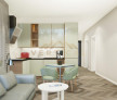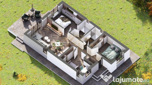 Fiecare casa are un teren de 300mp dintre care 200mp raman curte libera amenajata cu alei pietonale, terase si loc de parcare amenajat, iar casa are 73mp utili compusi din: