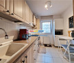 Bucataria moderna si mobilata complet, separata de living, cu o suprafata potrivita de peste 7 mp, ofera suficient spatiu pentru lucru si depozitare, chiar si pentru un loc de servit rapid masa in doi.