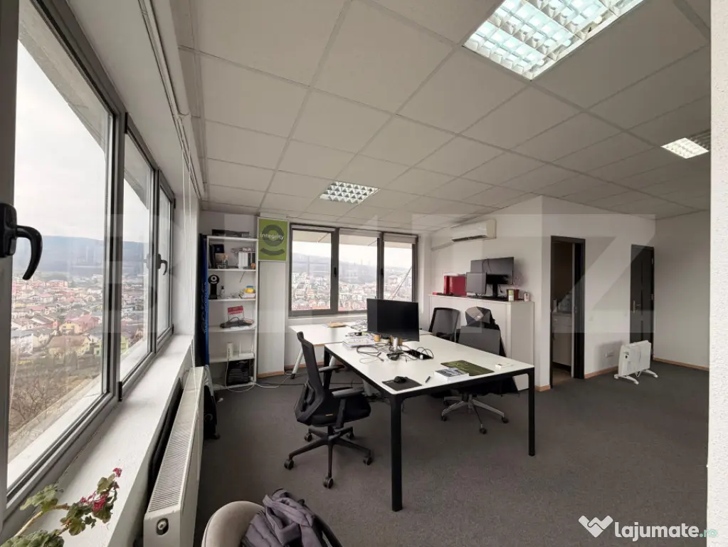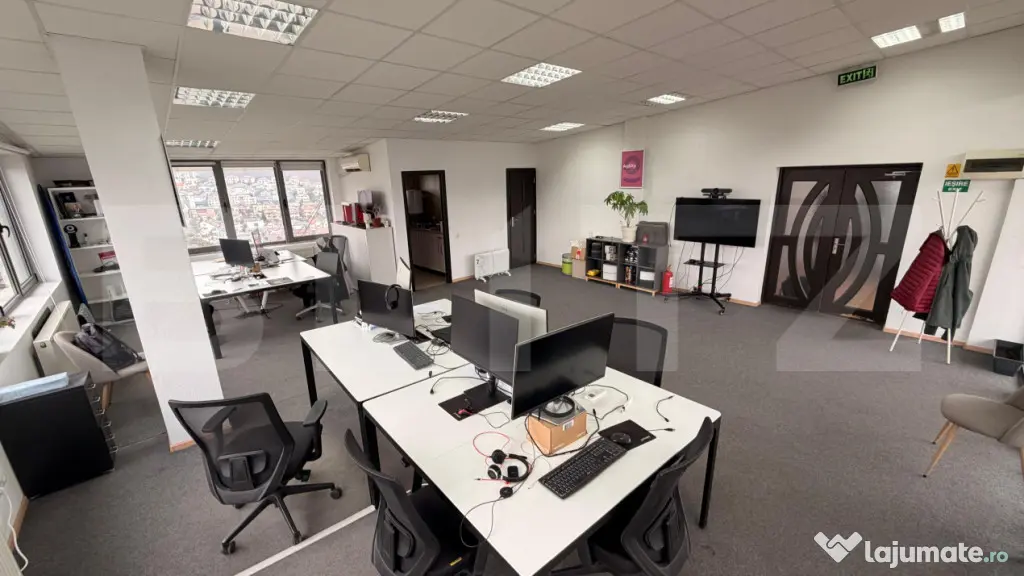 Suprafața utilă este de 70 mp, compartimentată open space, cu bucătărie și baie dublă. Dispune de o terasă de 20 mp, iar orientarea sudică asigură lumină naturală pe tot parcursul zilei. Spațiul beneficiază de o panoramă deschisă, oferind un mediu de lucru plăcut.
