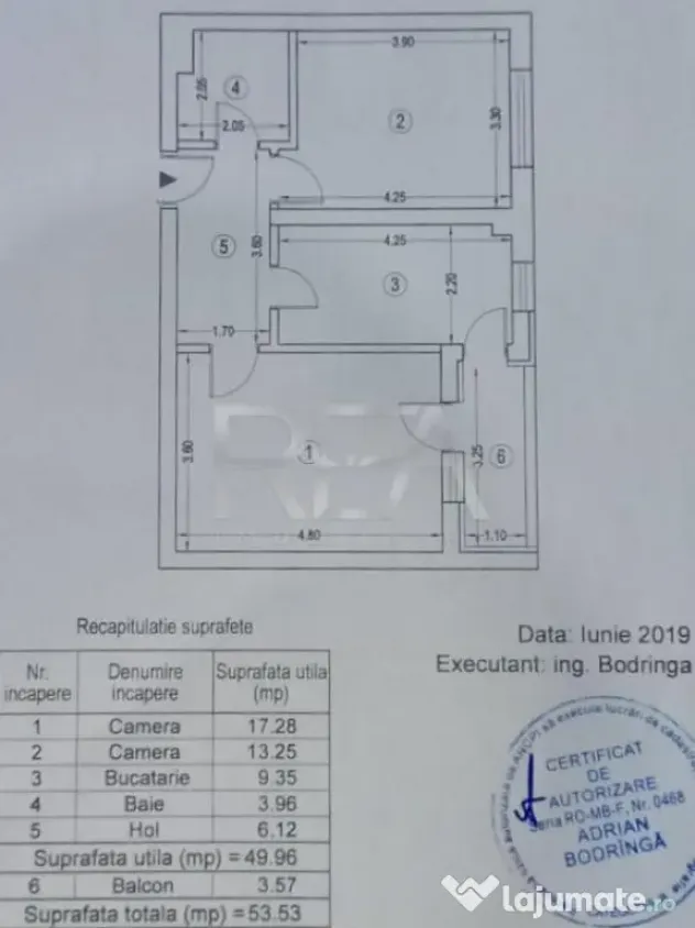 – Suprafață totală de 53,5 mp: 50 mp utili+ 3,5 mp balcon.