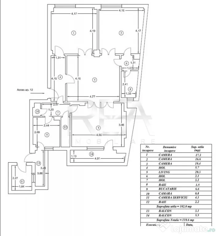 Suprafata totala 119,6 mp: utila 102 mp, balcoane 8,6 mp.