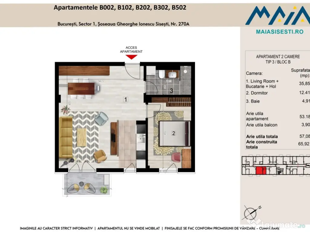 Preturile afisate sunt promotionale, pentru un avans de 50%. Acestea sunt fara TVA si cu predare la stadiul semifinisat | Costul finisajelor este de 150 EUR fara TVA pe mp construit. Avem plăcerea să vă prezentăm oportunitatea de a achiziționa un apartament în proiectul rezidențial Maia Sisesti, faza a 2-a, situat pe Soseaua Gheorghe Ionescu Sisesti, la doar 350 de metri de Stația de metrou Straulesti. În cadrul ansamblului rezidențial Maia Sisesti, vă oferim un mix variat de apartamente cu 1, 2, 3 și 4 camere, fiecare cu avantajele lor specifice. Astfel, putem răspunde nevoilor și preferințelor tuturor clienților noștri. Indiferent dacă căutați un spațiu confortabil pentru un singur locuitor sau o locuință mai generoasă pentru o familie, veți găsi aici soluția ideală pentru dumneavoastră. Fiecare tip de apartament este proiectat cu atenție la detalii și finisaje de calitate superioară, oferindu-vă confort și bunăstare în noua voastră casă. Dotari ansamblu: - Ansamblul rezidențial va beneficia de ascensoare Schindler în fiecare corp de clădire, pentru acces facil. - Spațiile verzi amenajate vor oferi un mediu plăcut și relaxant în jurul blocurilor. - Casa scării și spațiile comune vor fi finisate modern, oferind un aspect primitor și estetic plăcut. Finisaje fixe: - Finisajele interioare vor asigura confort termic și acustic, permițându-vă să vă bucurați de intimitate și liniște. - Centrala termică și instalație termică pentru confort termic și apă caldă. - Ușa de intrare va fi din metal, imbracată în MDF, asigurând siguranță și izolare termică. - Tamplaria PVC cu geam termopan va asigura izolare termică și fonică eficientă. - Obiecte sanitare de calitate superioară pentru băi elegante și funcționale. - Gletul și șapele aplicate vor pregăti apartamentul pentru finisaje suplimentare. - Conexiunea pentru telefonie, internet și cablu TV va asigura conectivitatea dorită. - Instalația electrică. Finisaje la alegere (diverse modele): Pentru a vă personaliza apartamentul după preferințele dumneavoastră, puteți opta pentru finisaje opționale, cum ar fi: - Parchet laminat din aproximativ 10 modele disponibile. - Gresie și faianță în 3 variante, pentru un aspect modern și rafinat. - Uși interioare, cu diverse modele și culori, pentru a completa designul interior. Bransamente: Blocurile vor fi bransate la energie electrică, gaze naturale, apă și canalizare, oferind toate utilitățile necesare pentru a satisface nevoile rezidenților. De asemenea, locatarii vor avea acces la servicii de cablu, internet și telefonie, asigurând conectivitate și comunicare fără întreruperi. Parcari: Ansamblul beneficiază de facilități de parcare moderne. Acestea se regasesc la nivelul subsolurilor si demisolurilor celor doua corpuri si sunt contra cost. Preturile si diponibilitatile pot fi accesate oricand pe site-ul proiectului (maiasisesti*ro). Avantaje ale locației: - Acces facil la stația de metrou Straulesti, la doar 350 de metri distanță. - În apropiere se găsesc numeroase școli, grădinițe și unități de învățământ, precum și facilități recreative și de divertisment, cum ar fi Parcul Dendrologic Chitila și Palatul Mogoșoaia. - Enayati Medical City si Spitalul Regina Maria Băneasa asigură servicii de sănătate de calitate. - Diverse opțiuni de shopping în apropiere, inclusiv Băneasa Shopping City și Colosseum Mall. Transport - Statia de metrou Straulesti (350 m); - Statia de autobuz "Bucuresti Targoviste" [205]; - Statia de autobuz "2 Cocosi" [204, 304, 436]; - Aeroportul Aurel Vlaicu; Scoli si gradinite - Scoala/Gradinita Aletheea; - Scoala/Gradinita internationala Matei; - Scoala gimnaziala, Nr. 13; - Scoala gimnaziala, Nr. 6; - Scoala gimnaziala, Nr. 1; Recreere & Entertainment - Parcul Dendrologic Chitila; - Parcul Mogoşoaia; - Palatul Mogoşoaia; - Parcul Bazilescu; - Parcul Regele Mihai I al României. Ingrijire si sanatate - Spitalul Regina Maria Băneasa; - Enayati Medical City; Shopping - Băneasa Shopping City; - Colosseum Mall; - Mega Image Shop & Go; - Kaufland Straulesti, etc. Nu ratați această oportunitate de a vă achiziționa un apartament nou într-o zonă în dezvoltare rapidă, cu acces facil la metrou și numeroase facilități în jur. Pentru mai multe informații și pentru a programa o vizionare, vă rugăm să ne contactați la numărul de telefon 0799008822 sau să vizitați site-ul proiectului pe maiasisesti*ro. Confort: 1 Tip imobil: Bloc de apartamente Număr Băi: 1
