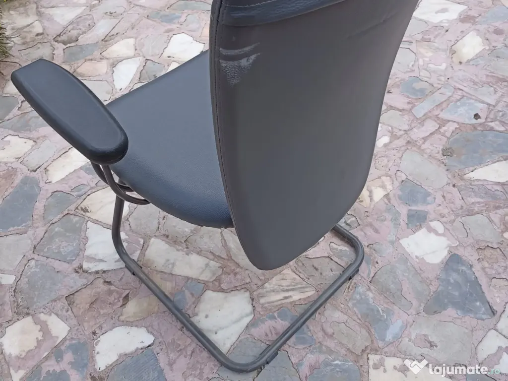 Două scaune de vizitator cu brațe, din piele ecologică gri, cu structură metalică de tip sanie. Scaunele sunt solide, în stare buna.
