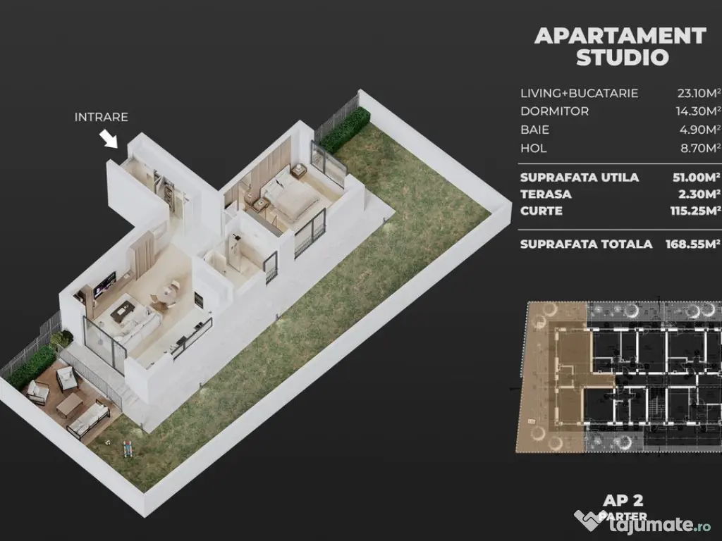 Direct dezvoltator -Comision 0% Birou vanzari(tel: 0720002332) ce ofera servicii(consiliere si asistenta bancara si notariala complete incluse, indiferent de modul de achizitie, cash /credit). Pret credit/cash: 113000euro, TVA inclus, include ap. 2cam. tip studio decomandat de (51mp utili + terasa de 2,3mp)/90610euro + curtea de aproximativ 115mp/19500euro + 1 loc de parcare exterior/3000euro, conform schitei atasate. Un ansamblu rezidential modern, aflat in constructie, situat in zona semicentrala(S-V) din Popești-Leordeni, avand termen de predare in vara anului 2027. Pe langa schita care corespunde apartamentului propus pentru vanzare, aveti atasate si randarile ansamblului/blocului din care face parte, dar si cateva fotografii dintr-un proiect asemanator finalizat si vandut integral in urma cu cateva luni, al aceluiasi dezvoltator. In proximitate: Mega Image centru Popesti Leordeni(15min pe jos), statie STB- Viilor(7min pe jos), metrou Pta Sudului(15min cu STB. Proximitatea fata de Bucuresti asigura conectivitatea rapida atat catre centrul capitalei cat si catre sectorul 3(Dristor - Pallady -N. Teclu, in 15min cu masina personala). Confort: 1 Tip imobil: Bloc de apartamente Număr Băi: 1 Posibilitate parcare: Da Nr. locuri parcare: 1