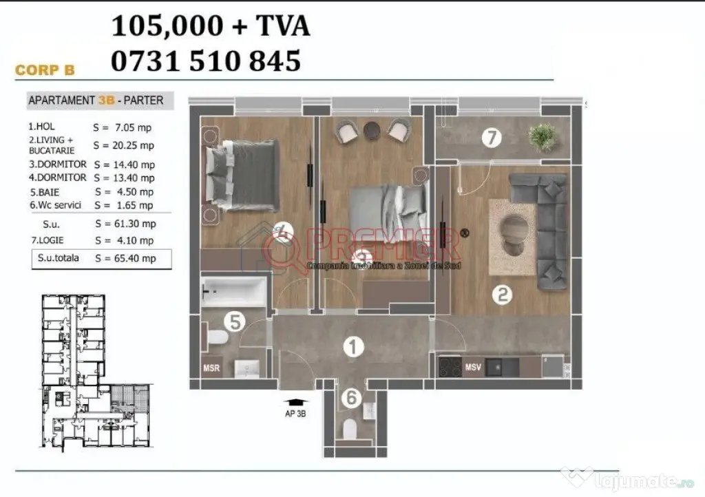 Premier Imobiliare vă propune spre vânzare un apartament de 3 camere semidecomandat, situat la mezaninul unui imobil cu 6 etaje, într-un complex rezidențial modern din zona Postalionului – Parcul Tudor Arghezi. Suprafața utilă totală este de 65,40 mp, ideal compartimentată pentru o locuire confortabilă.