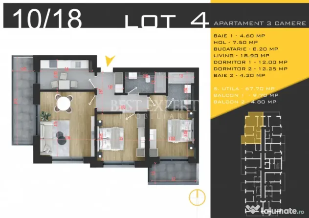 Suprafata utila - 67.7 mp utili +14.48 mp balcon, total 82.18 mp utili
