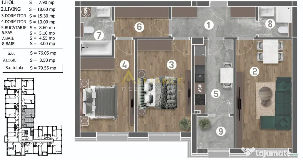 Apartamentul are suprafata totala de 79,5 mp, este amplasat la etajul 3 si dispune de balcon spatios, centrala termica proprie si compartimentare practica. Exista posibilitatea achizitionarii unui loc de parcare separat.