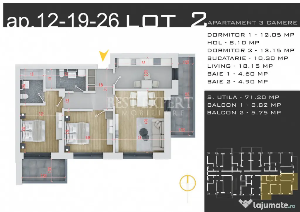 Suprafata utila - 71.21 mp utili +14.56 mp balcon, total 85.77 mp utili
